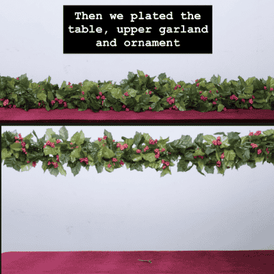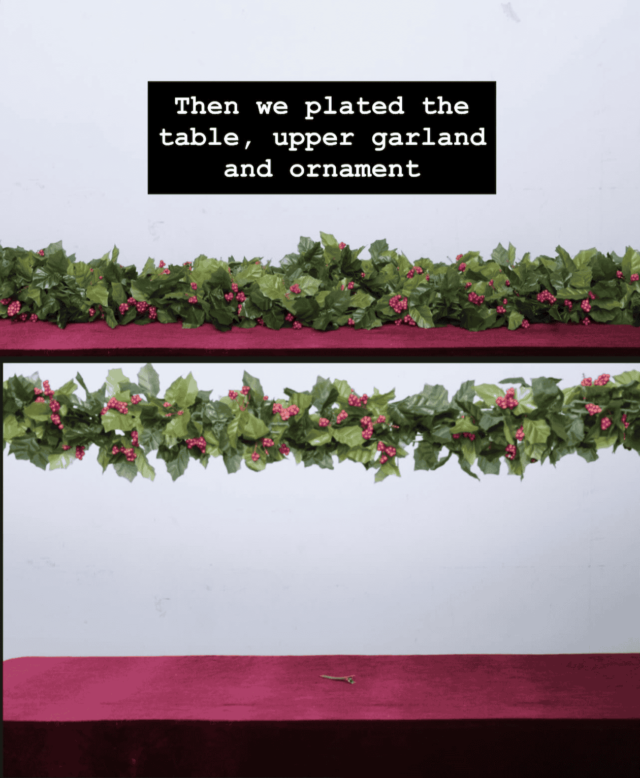 Then we plated the table, upper garland and ornament. Fun fact! This was the only “blank” round shiny christmas ornament we had in our entire house. So we went with it!