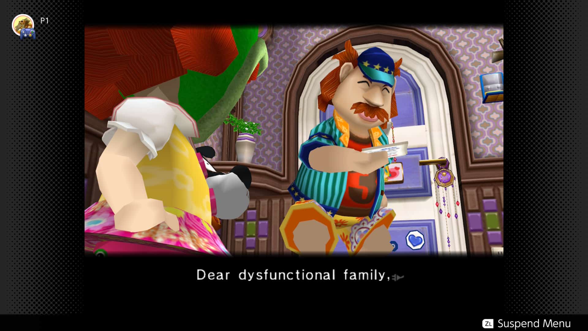 My first impressions are this game is pretty weird! Way weirder than I would have expected, to be honest. The game opens on a small family that are celebrating the birthday of a young girl who refuses to remove her frog-hood-costume-thing while her parents squabble about everything including money.