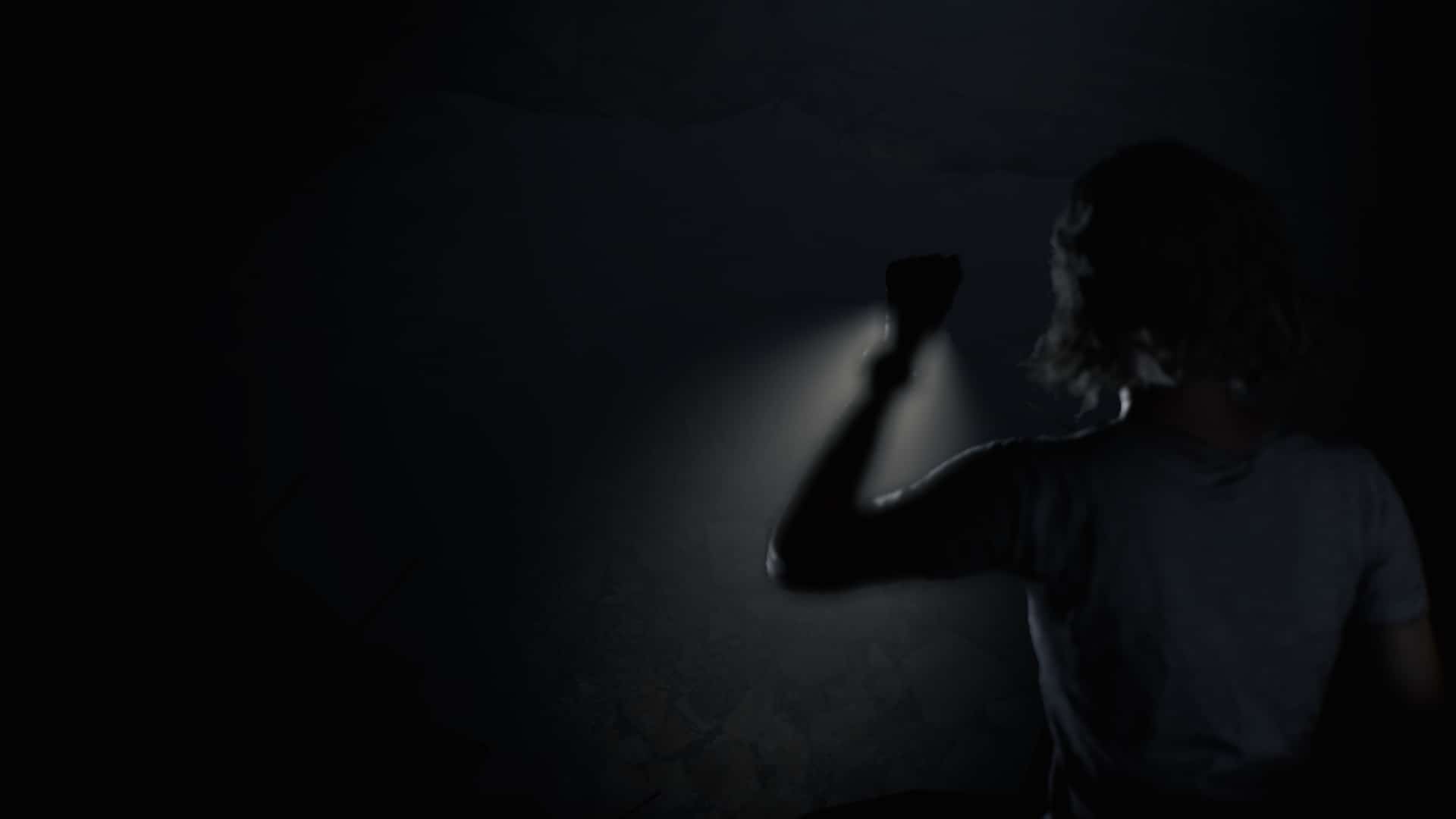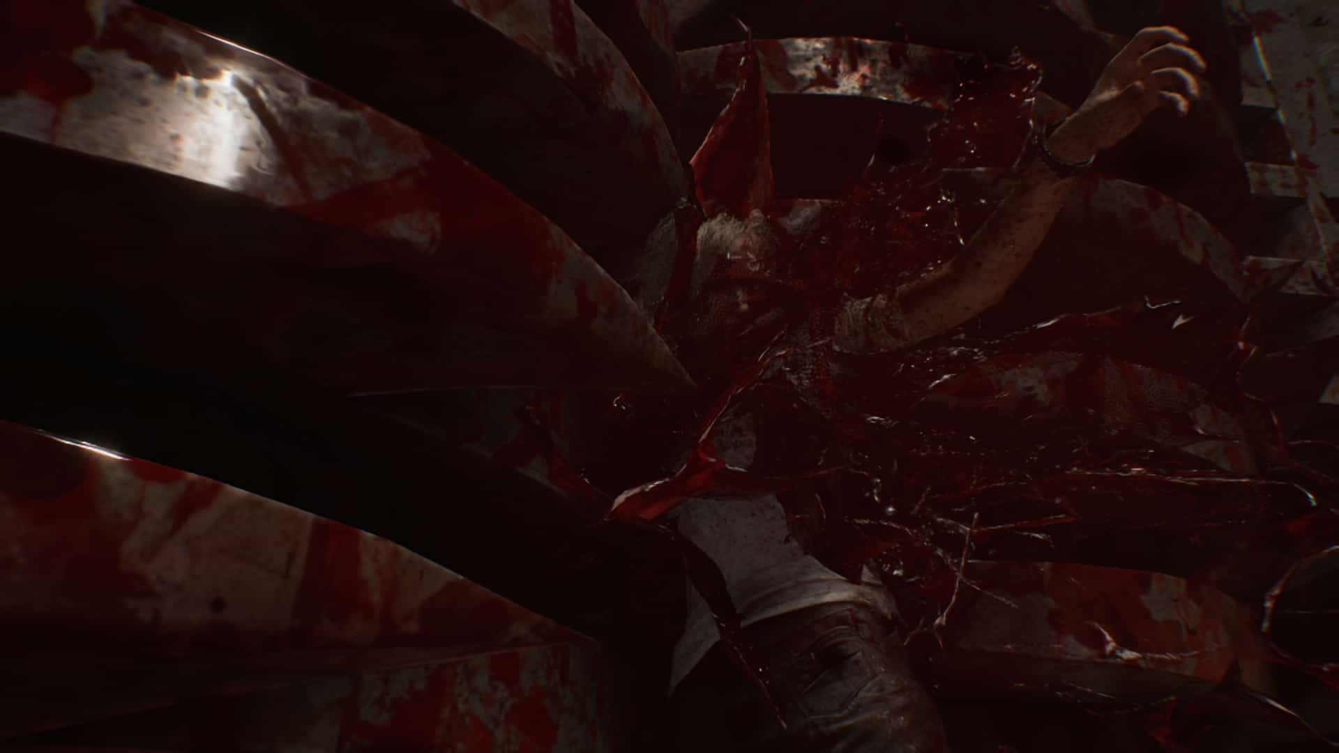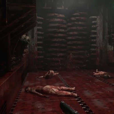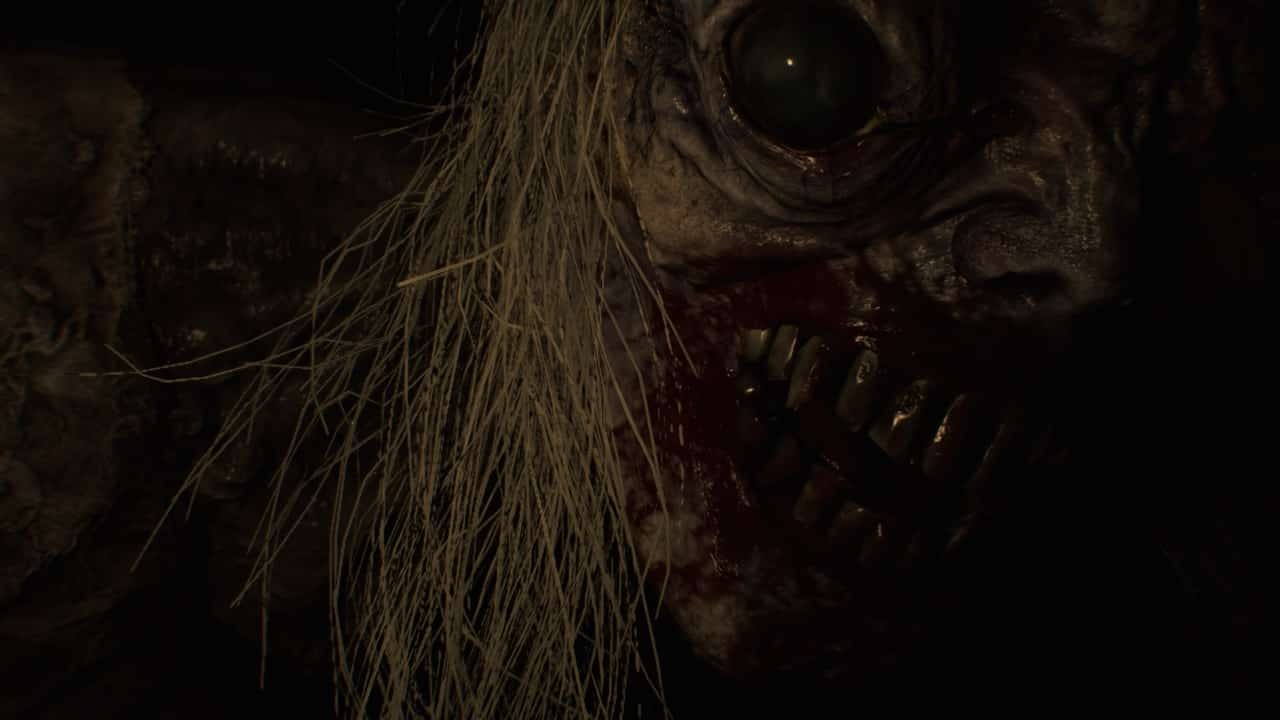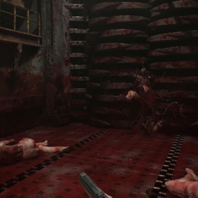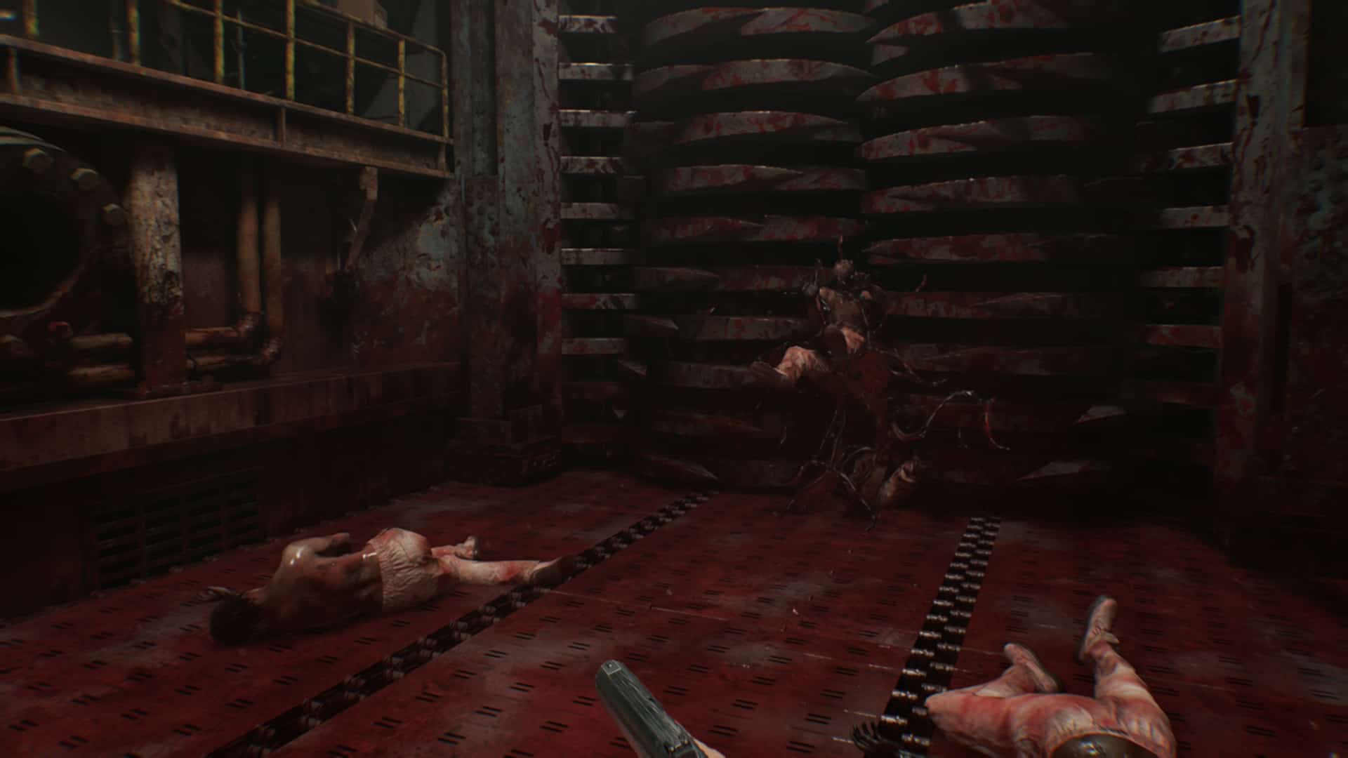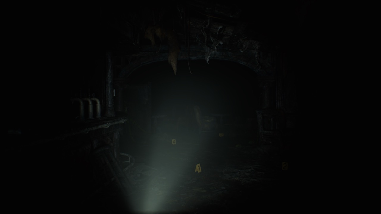 All of our fears have been our imagination or the wind or a precariously placed stack of buckets. Pulling from those environmental changes in RE7 - a chair falling over, something in the room feels different - as opposed to RE2/3 where a dead body falls from the ceiling or a floor above. Eventually we make our way down the largest stretch of dark room looking for some tool and open a door and BLAM are greeted by a dead body falling through a doorway, trapping us underneath. PHEW we thought it was a OH MY GOD WHAT THE FUCK IS THAT?!