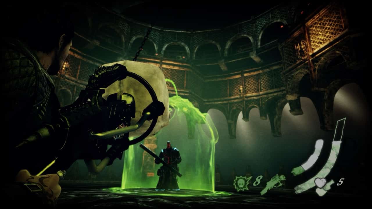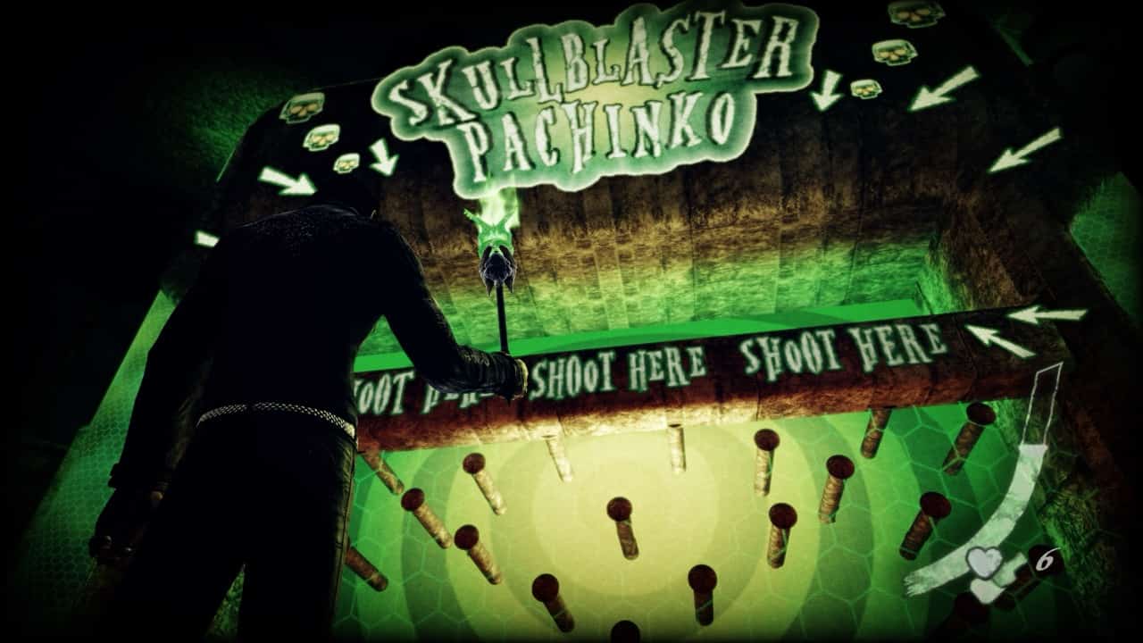 The final upgrade to the shotgun is the worst part of the game. Lobbing a giant, exploding skull is almost never something I’d choose to do, except when forced to solve a puzzle or beat Fleming, the final boss. Fleming will protect himself with this green shield that has three holes in the top, the problem is the aim is never precise enough. Immediately after firing the skull bowling ball, Garcia freezes up making it impossible to dodge for like 2-3 seconds. The mechanic needed more time to cook! I liked it when you actually bowled or played plinko with it, but that’s it.